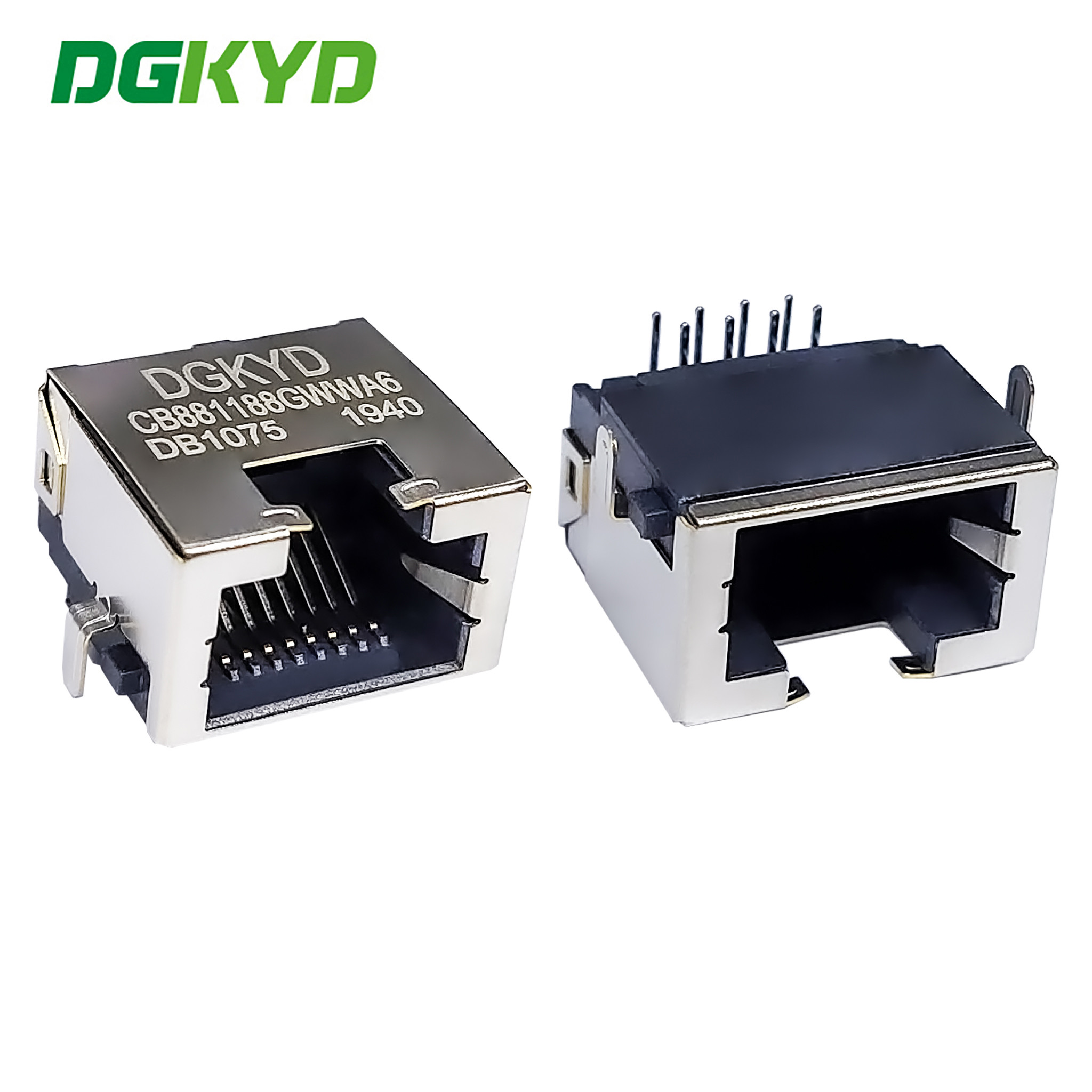 แจ็ค RJ45 แบบ SMT โปรไฟล์ต่ำพร้อมฉนวนป้องกันโลหะ ตัวเชื่อมต่อ RJ45 แบบ DIP 4.2 พร้อมฉนวนและไฟ DGKYDCB421188AB1W6DB1075
